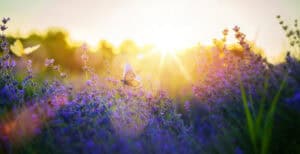 Summer meadow with many summer lavender flowers and butterflies on a sunny day